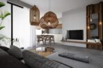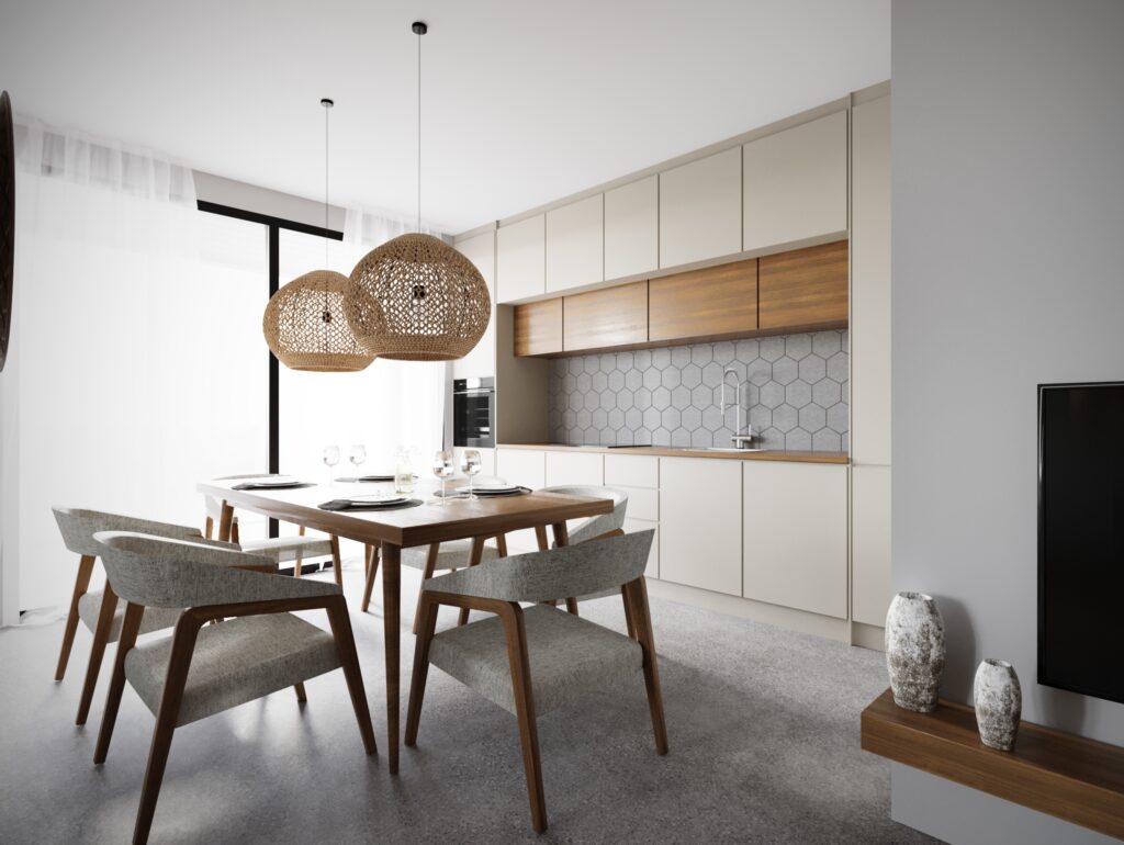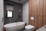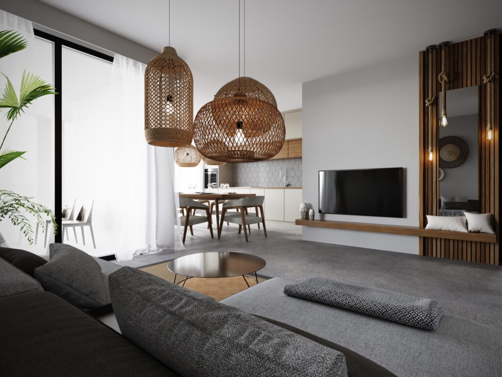 - Ponadto salon z wydzieloną strefą kuchenną oraz jadalnią, z którego prowadzi bezpośrednie wyjście na zadaszony taras